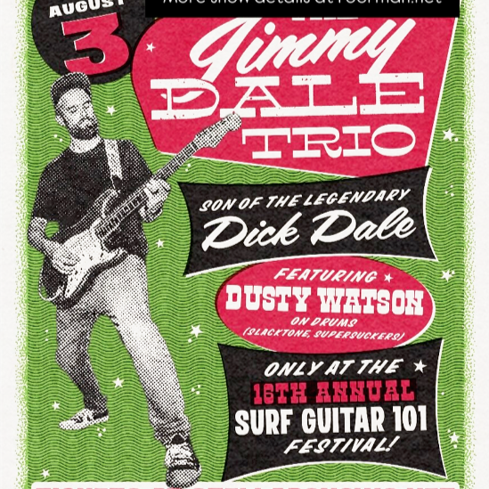 “The Jimmy Dale Trio is more, so like we tip the hat to my Dad. I'm starting to bleed in a couple of my own songs in the set, which are watered-down Kill Jill songs. I take the lyrics out, and I kinda write a guitar melody over them and make them really surfy, but I still keep it like power surf, like Dad tone, you know, not the thin guitar strings and over the top reverb. I keep it true to my Dad's tone.” —Jimmy Dale (The Jimmy Dale Trio, Son of Dick Dale, King of Surf Guitar)